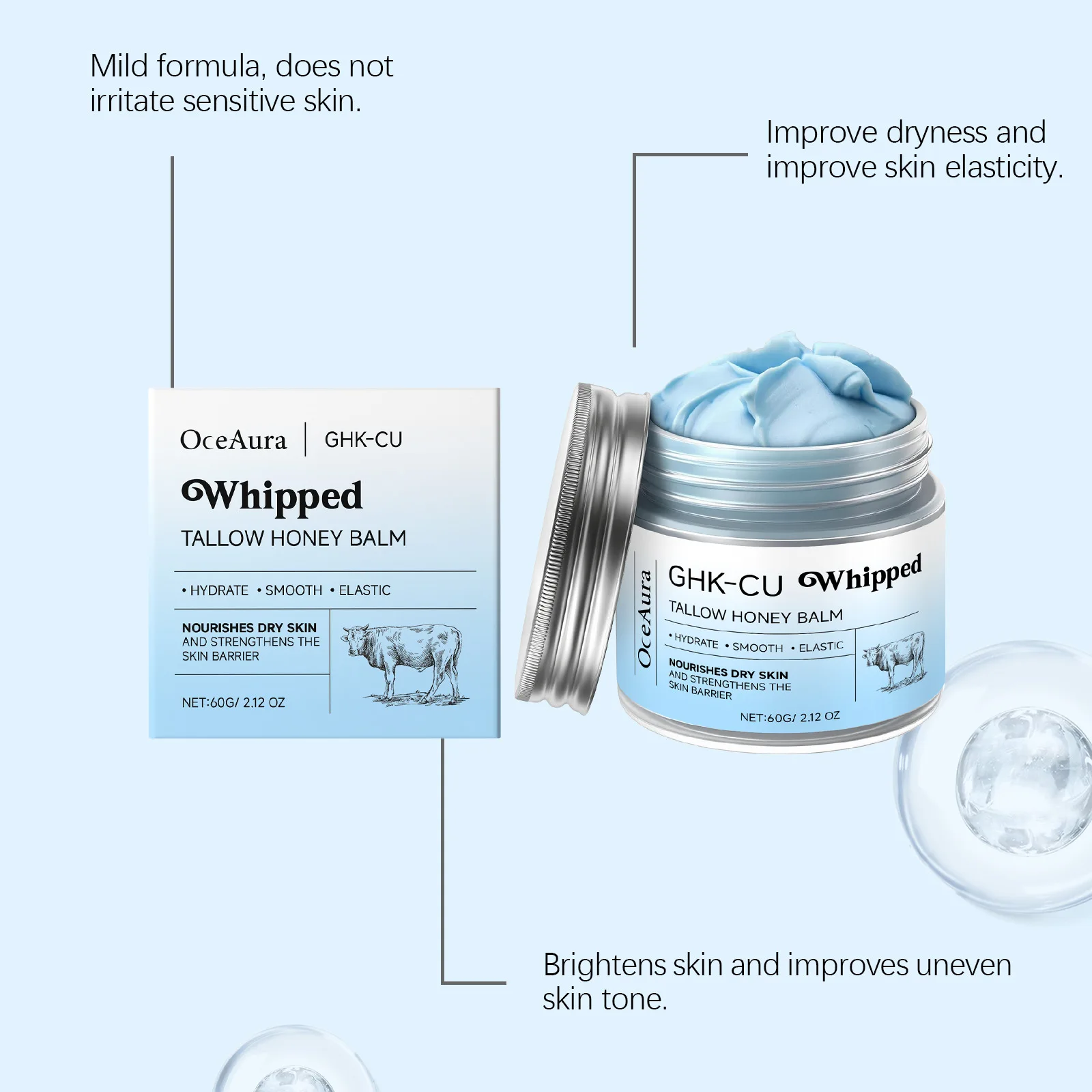 • Nourishing Grass-Fed Beef Tallow: Mimics skin’s natural oils to deeply moisturize and reinforce the skin barrier without clogging pores.