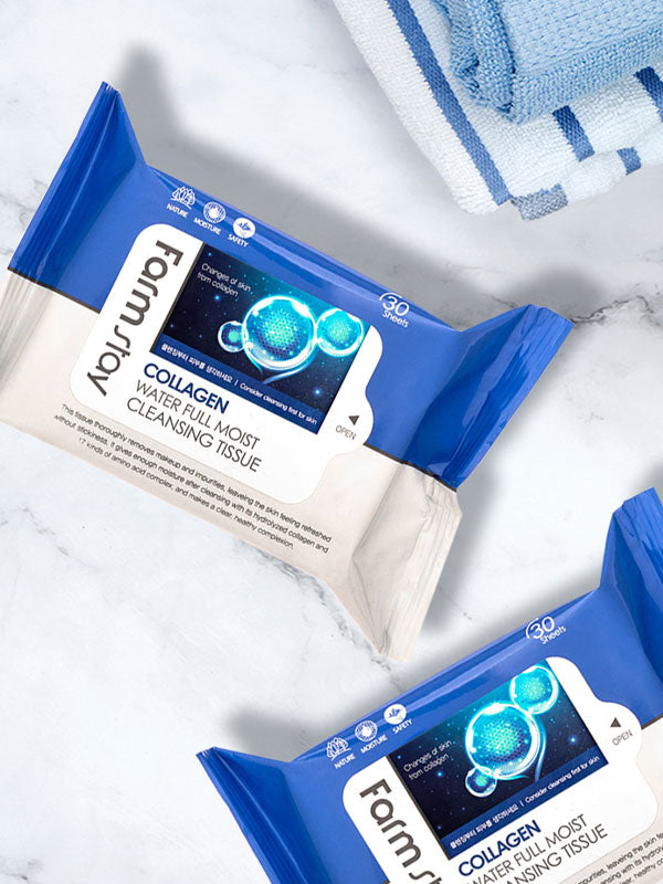 Farm Stay Collagen Water Full Moist Cleansing Tissue is designed for effective and gentle cleansing. Infused with marine collagen and an amino acid complex, these tissues not only remove makeup and impurities but also provide hydration and nourishment to the skin. They are formulated to leave the skin feeling refreshed and moisturized, with a clear and healthy complexion.