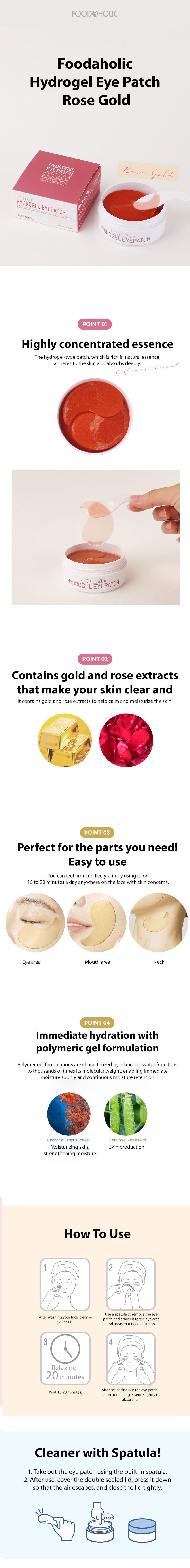 The Foodaholic Hydrogel Eye Patch in Rose Gold is a skincare product designed for those seeking to rejuvenate their under-eye area and other facial regions with specific concerns. This product boasts a highly concentrated essence infused with natural extracts, aiming to deliver deep hydration and a calming effect on the skin.