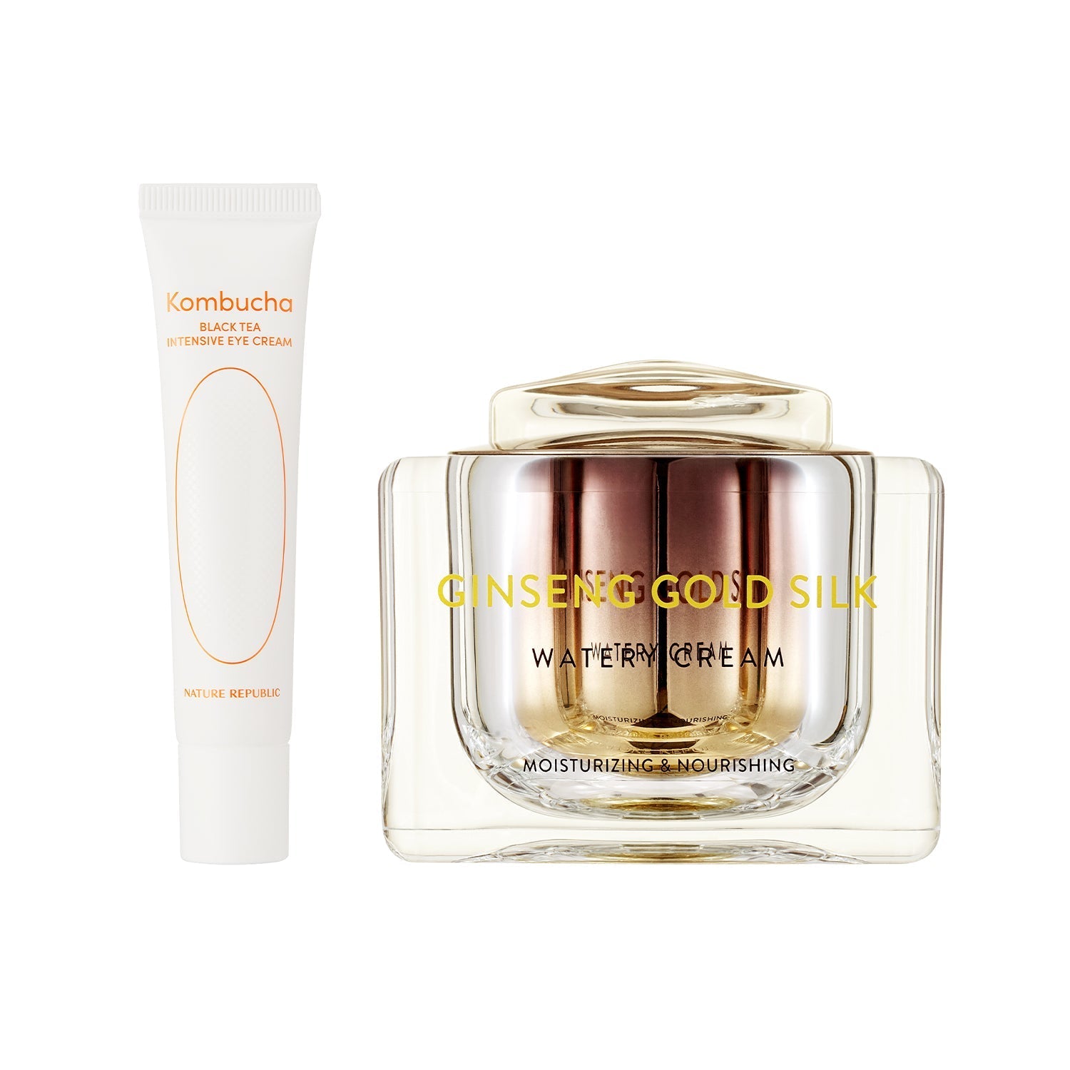The Kombucha Black Tea Eye Cream targets fine lines and boosts elasticity in delicate areas, while the 24K Gold Gel Cream deeply hydrates and brightens the entire face — creating a smooth, radiant, and youthful look.