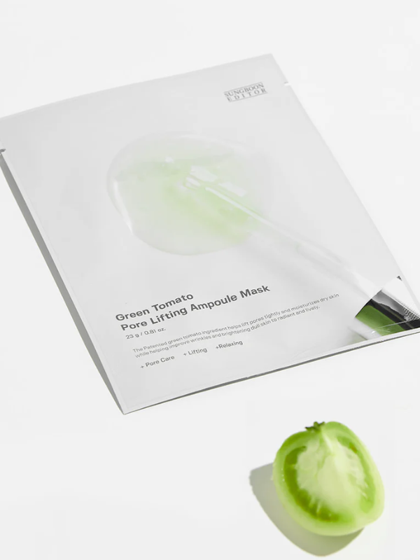 Sungboon Editor Green Tomato Pore Lifting Ampoule Mask is a sheet mask infused with a blend of green tomato extract, peptides, and plant-based ingredients. Designed to provide hydration and support skin elasticity, this mask aims to leave the skin feeling refreshed and supple.