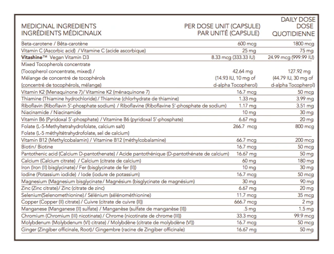 INGREDIENTS: Beta-Carotene, Vitamin C, Vitashine Vegan Vitamin D3, Mixed Tocopherols concentrate, Vitamin K2, Thiamine, Riboflavin, Niacin-amide, Vitamin B6, Folate (L-5 Methyltetrahydrofolate, calcium salt), Vitamin B12, Biotin, Pantothenic acid, Calcium citrate, Iron II bisglycinate, Potassium iodide, Magnesium Bisglycinate, Zinc citrate, Selenomethionine, Copper II citrate, Manganese II sulfate, Chromium III nicotinate, Molybdenum VI citrate, and Ginger